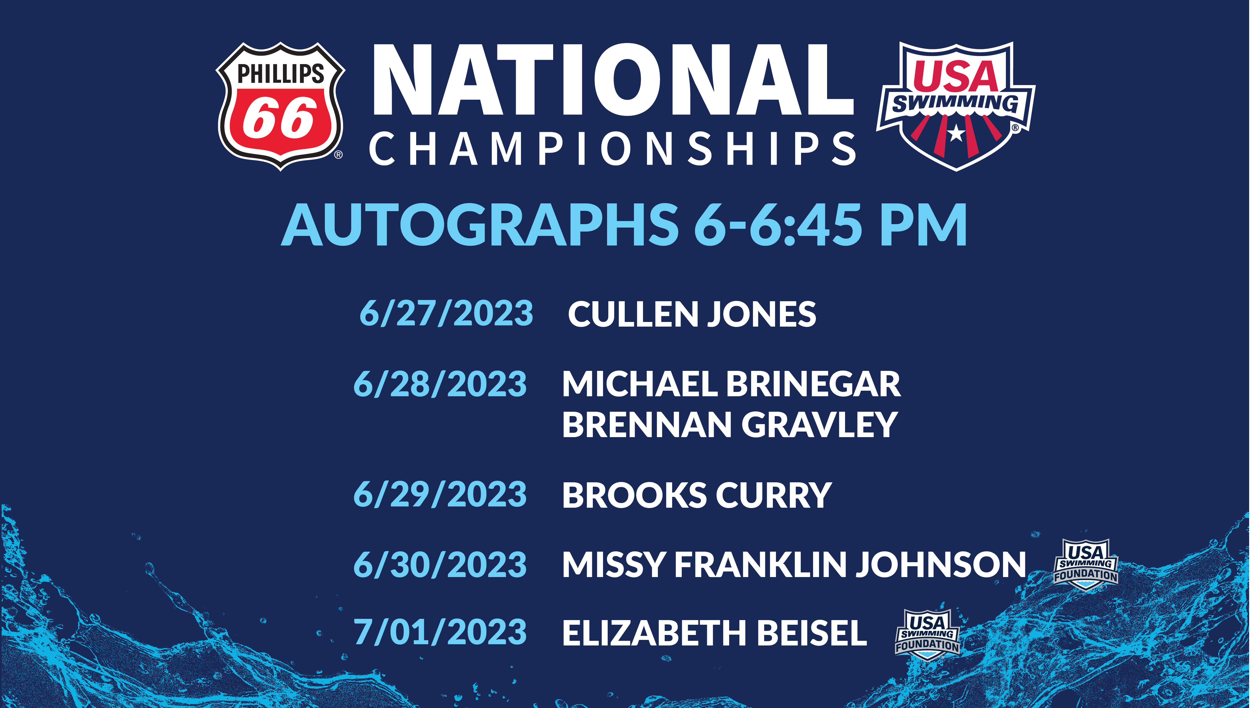 This summer the Indiana University Natatorium will be the site of USA Swimming’s most prestigious 2023 event, the 2023 Phillips 66 National Championships. These championships will be contested over five days starting on Tuesday, June 27, and culminating on Saturday, July 1. Each competition day will consist of a preliminary session beginning at 10:00 AM and a finals session at 7:00 PM (Eastern). There will be daily athlete autograph signings before finals in the Toyota Aqua Zone located in the gymnasium on the upper level of the Natatorium.